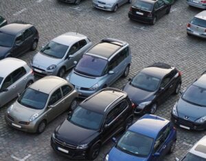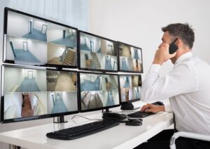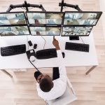African american employee following delivery trucks around the city, sending gps coordinates for cargo location by using satellite map. Monitoring couriers in traffic on CCTV footage.