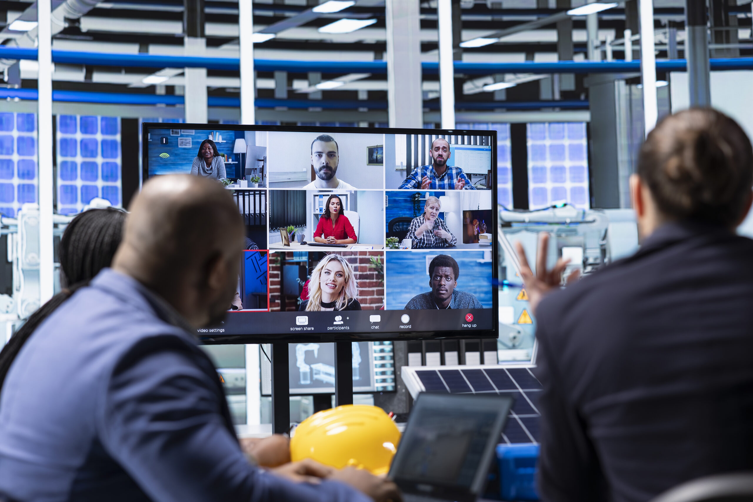 Solar panels plant manager doing online videocall with investors to present manufacturing strategies. Photovoltaics factory executive in teleconference meeting with shareholders showing data